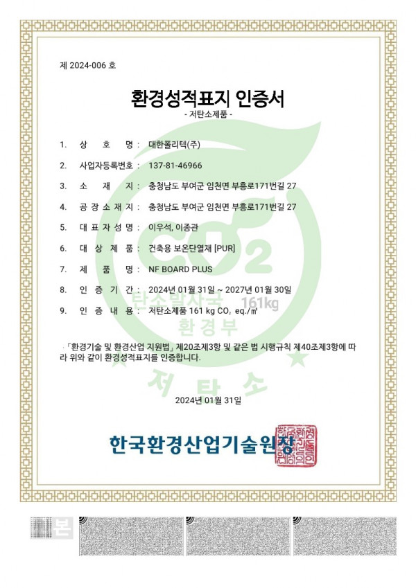 NF보드 PLUS- 심재준불연 - 저탄소제품 - 환경성적표지 인증 획득 - 2024년 1월 31일